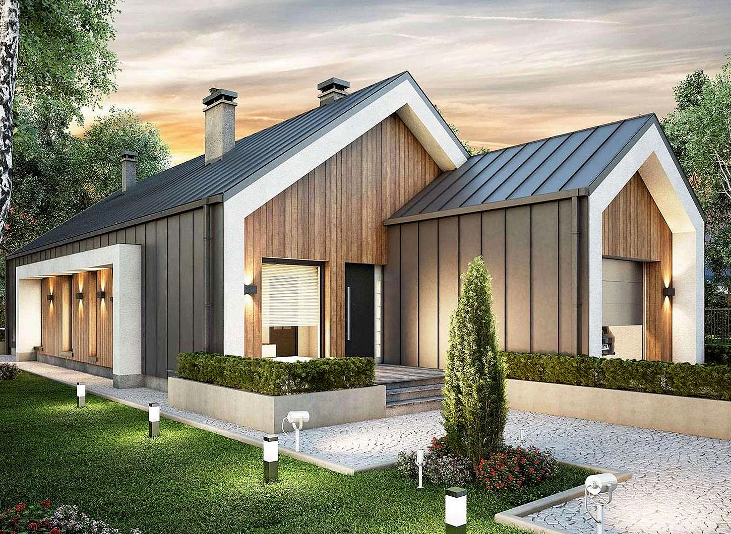 Egyszerű épület egyállásos garázzsal, nyeregtetővel. Modern stílusa, amelyet a felhasznált befejező anyagok hangsúlyoznak. A tetőn és az oldalfalakon a szemet gyönyörködtető titán-cink fémlemez dominál. A hűvös színeket az épület oromzatában és az oldalsó homlokzatokon használt faelemek törik meg. Négytagú család számára készült, lakó- és hálórésszel állnak a rendelkezésükre. A nappali központi helye a konyha, az étkező és a nappali, amelyek nyitott tér, szabad mennyezeti gerendákkal. A nagy teraszajtók természetes fénnyel jól megvilágítják a belső teret, és a kertbe nyílnak. A mennyezet megszüntetésével a tető ablakai további fényforrást biztosítanak. A szigetes konyha közös főzésre ösztönöz. A nappalit egy nagy garázshoz csatlakozó előtér, egy kazánház és egy fürdőszoba egészíti ki. Az éjszakai részben három hálószoba és egy nagy fürdőszoba található. A szülők hálószobájából van kijárat a teraszra. Kis szélessége miatt, remek választás keskeny telkekhez.